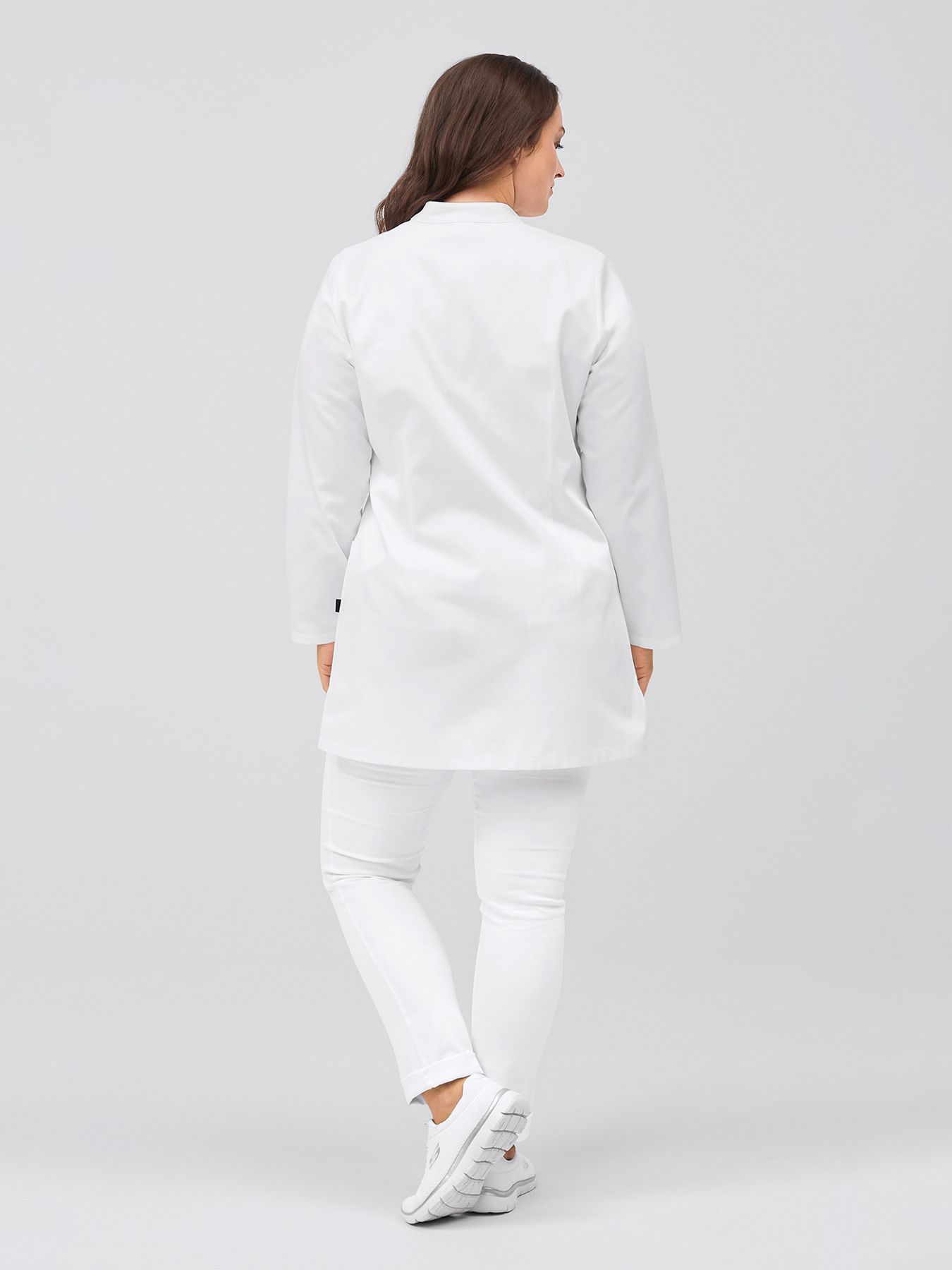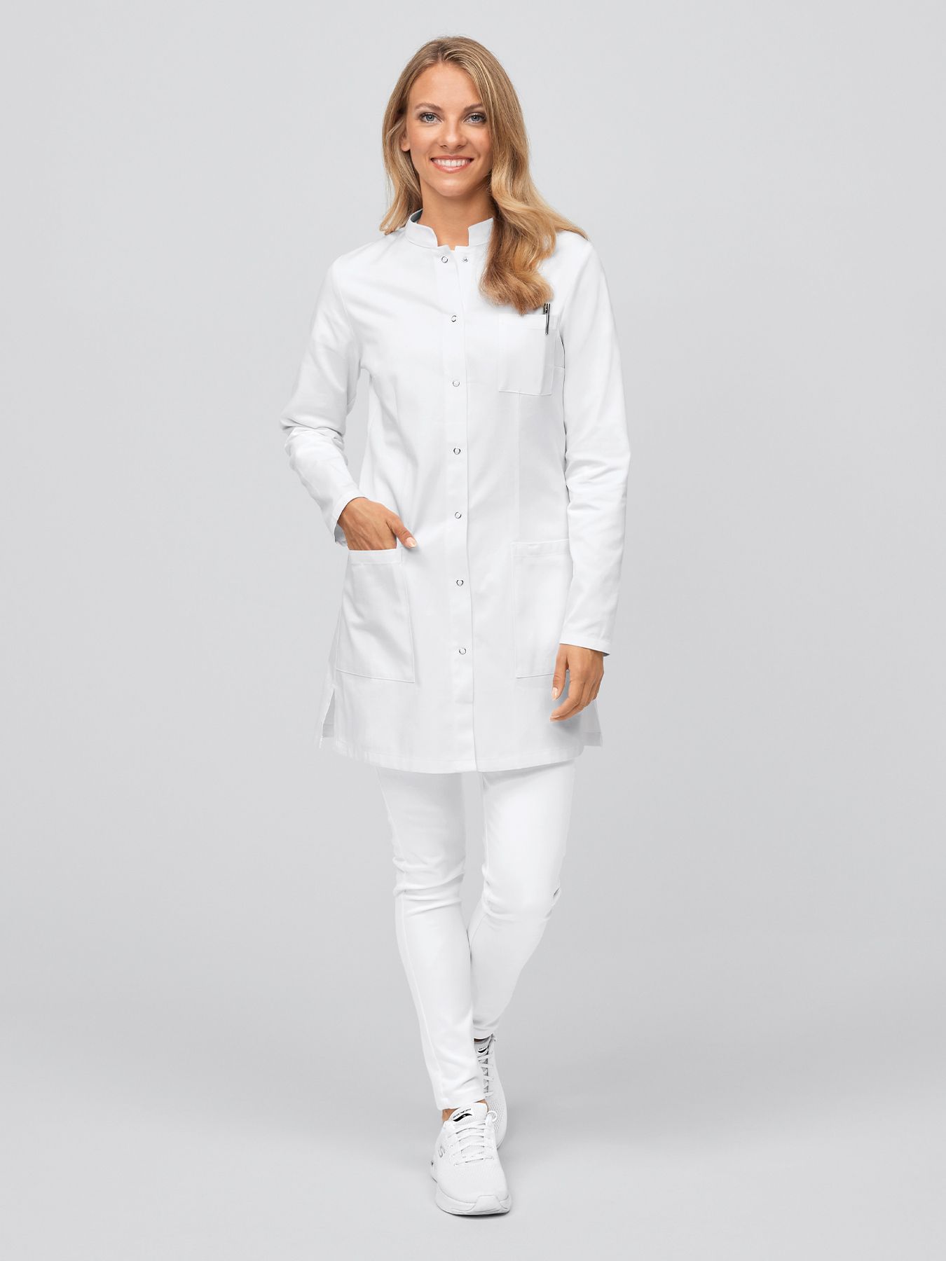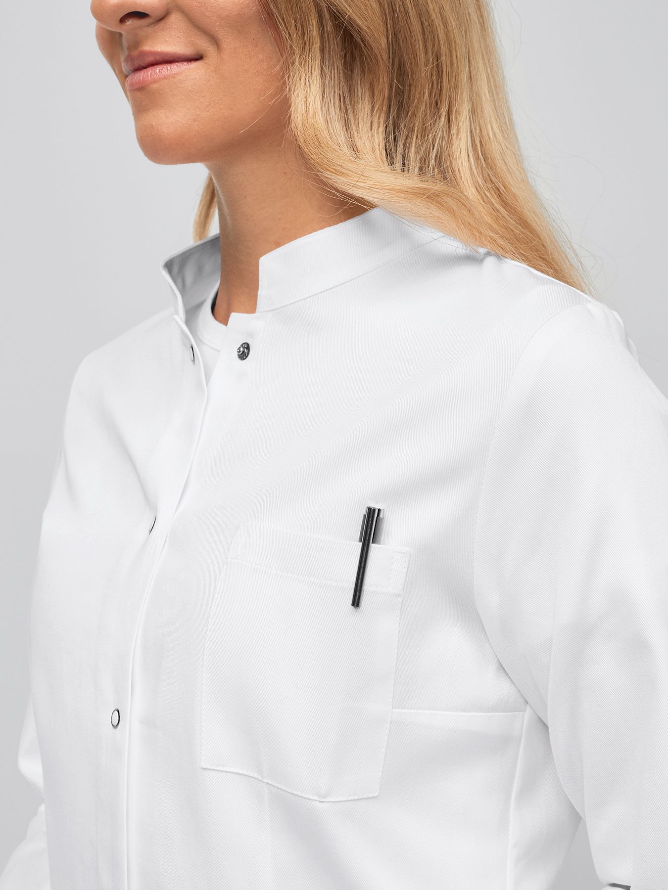 Lékařský plášť se stojáčkem, 2 boční kapsy, 1 náprsní kapsa, dlouhé rukávy, zapínání na patentky, pohodlné postranní rozparky, tvarovací záševky. Délka zad u velikosti S cca 83 cm. 100% bavlna, 210 g/m², praní na 95 °C, vhodné do sušičky.