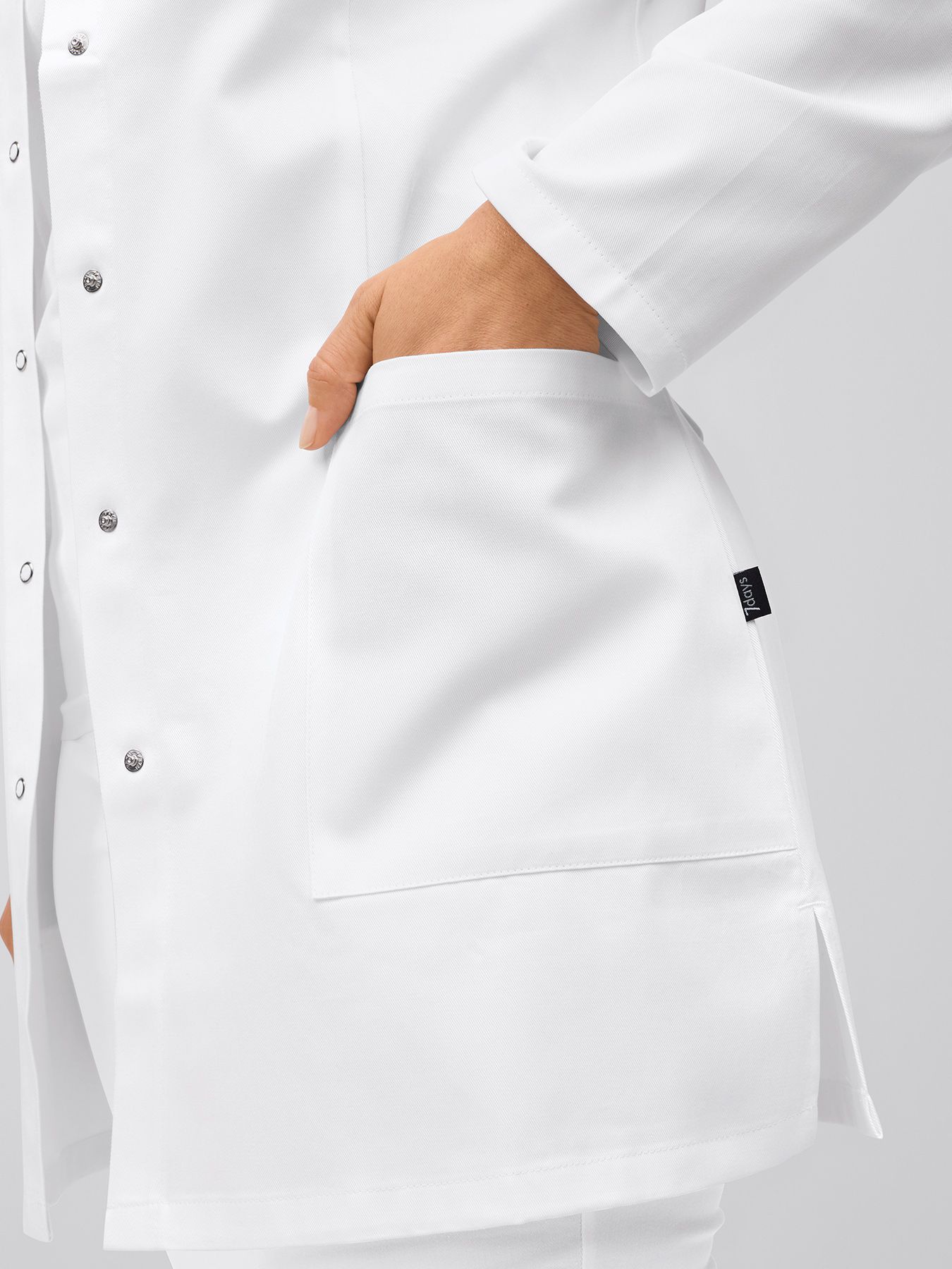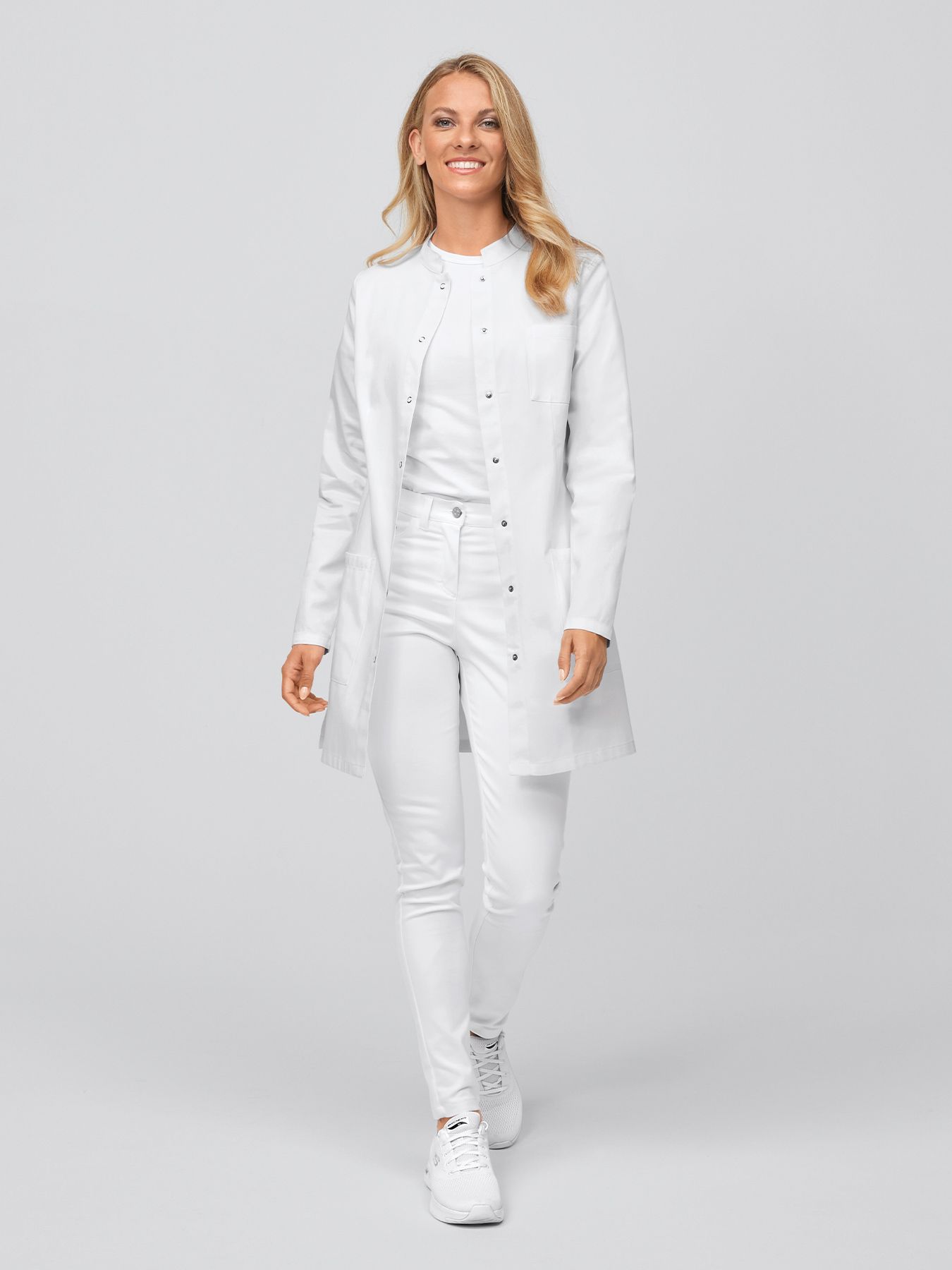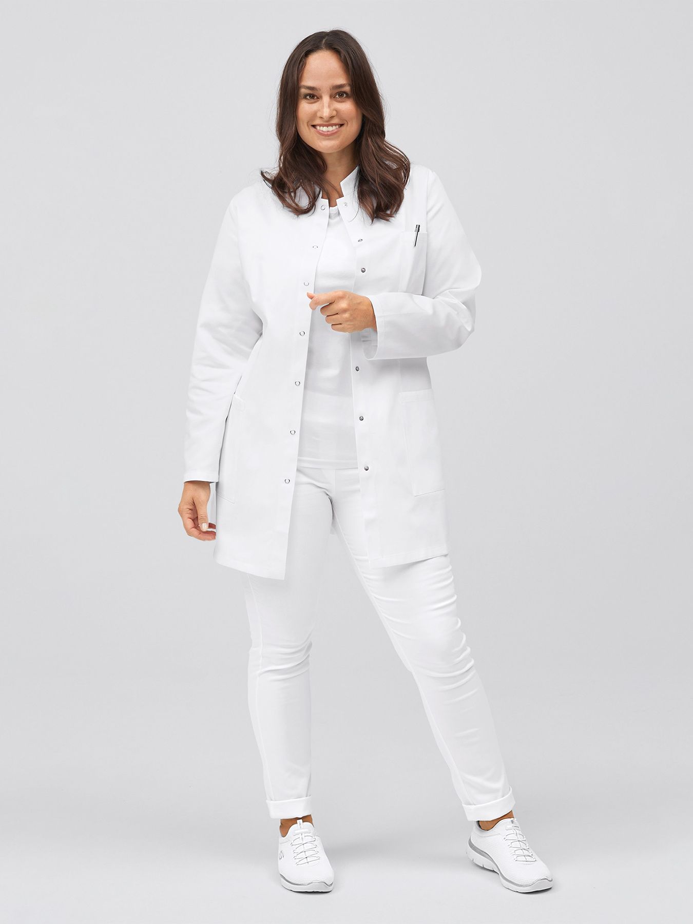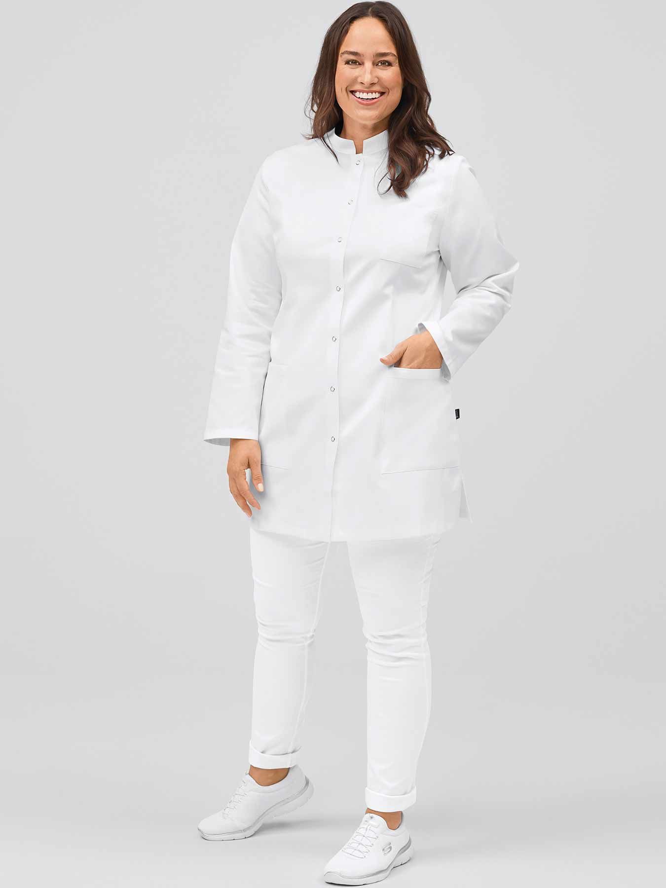 Lékařský plášť se stojáčkem, 2 boční kapsy, 1 náprsní kapsa, dlouhé rukávy, zapínání na patentky, pohodlné postranní rozparky, tvarovací záševky. Délka zad u velikosti S cca 83 cm. 100% bavlna, 210 g/m², praní na 95 °C, vhodné do sušičky.