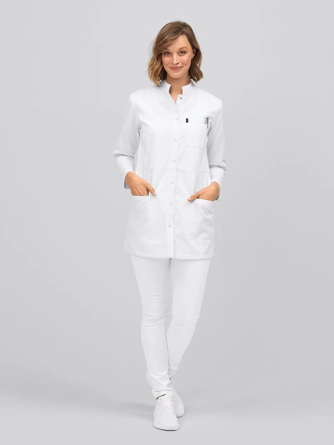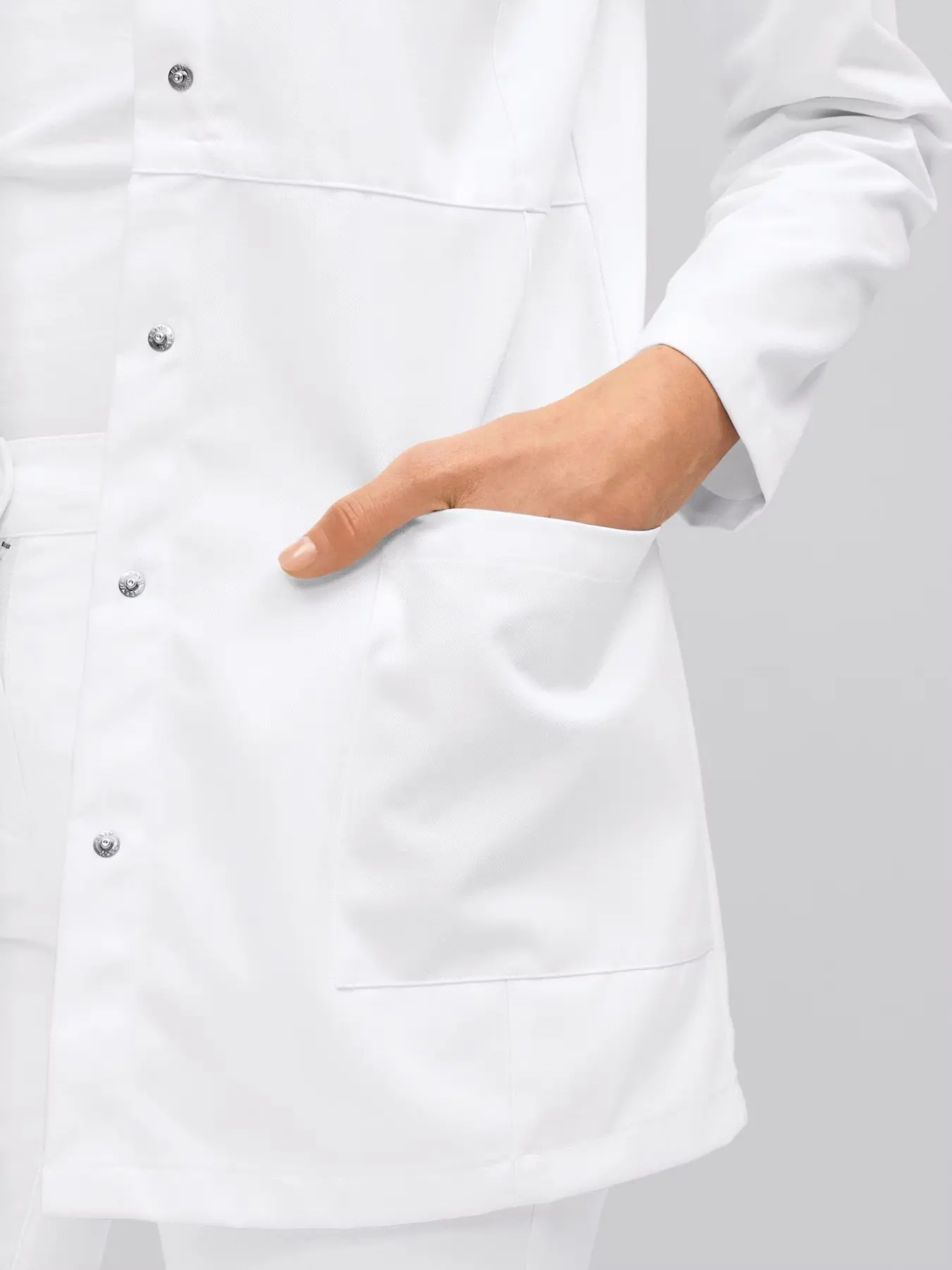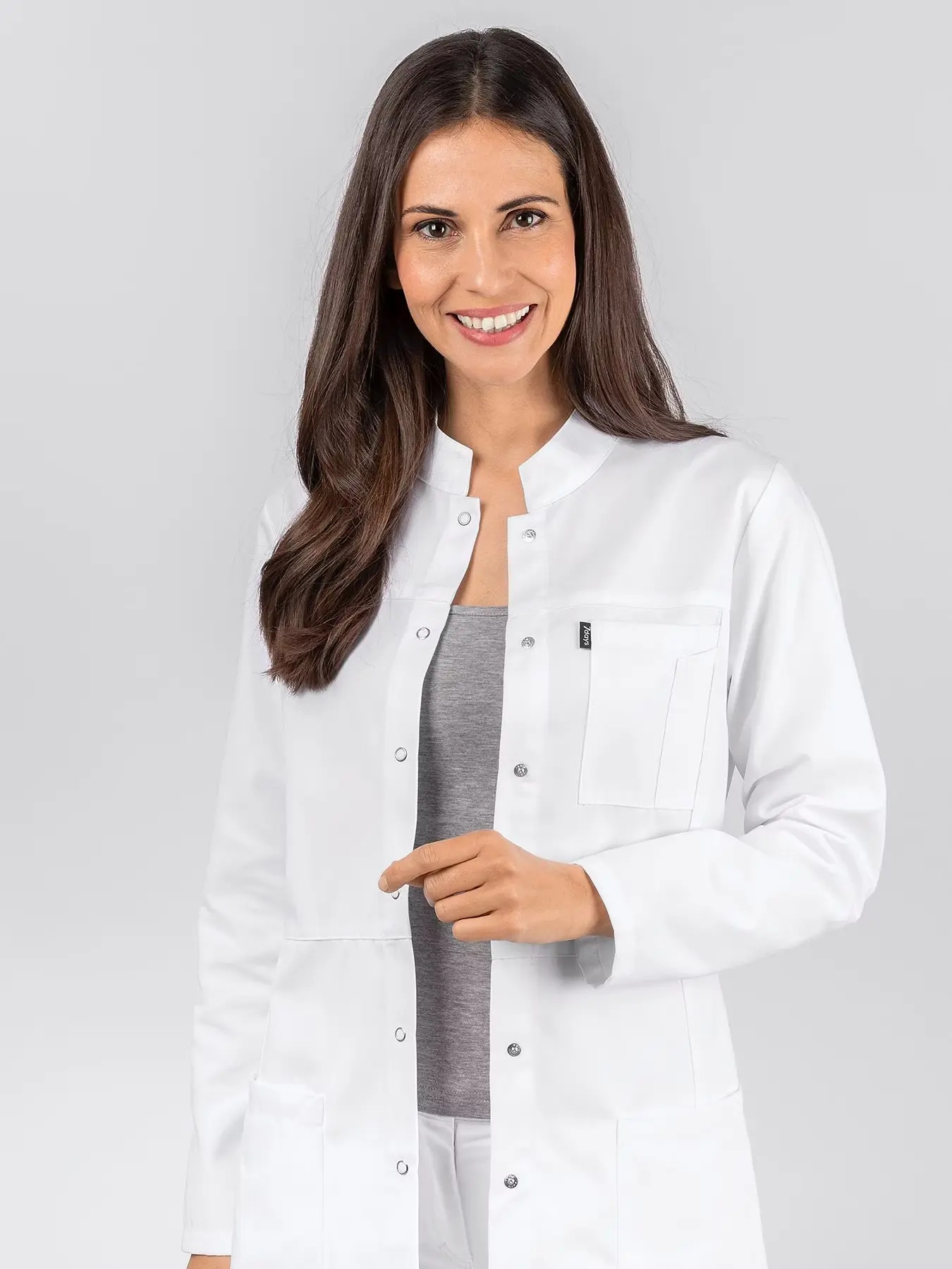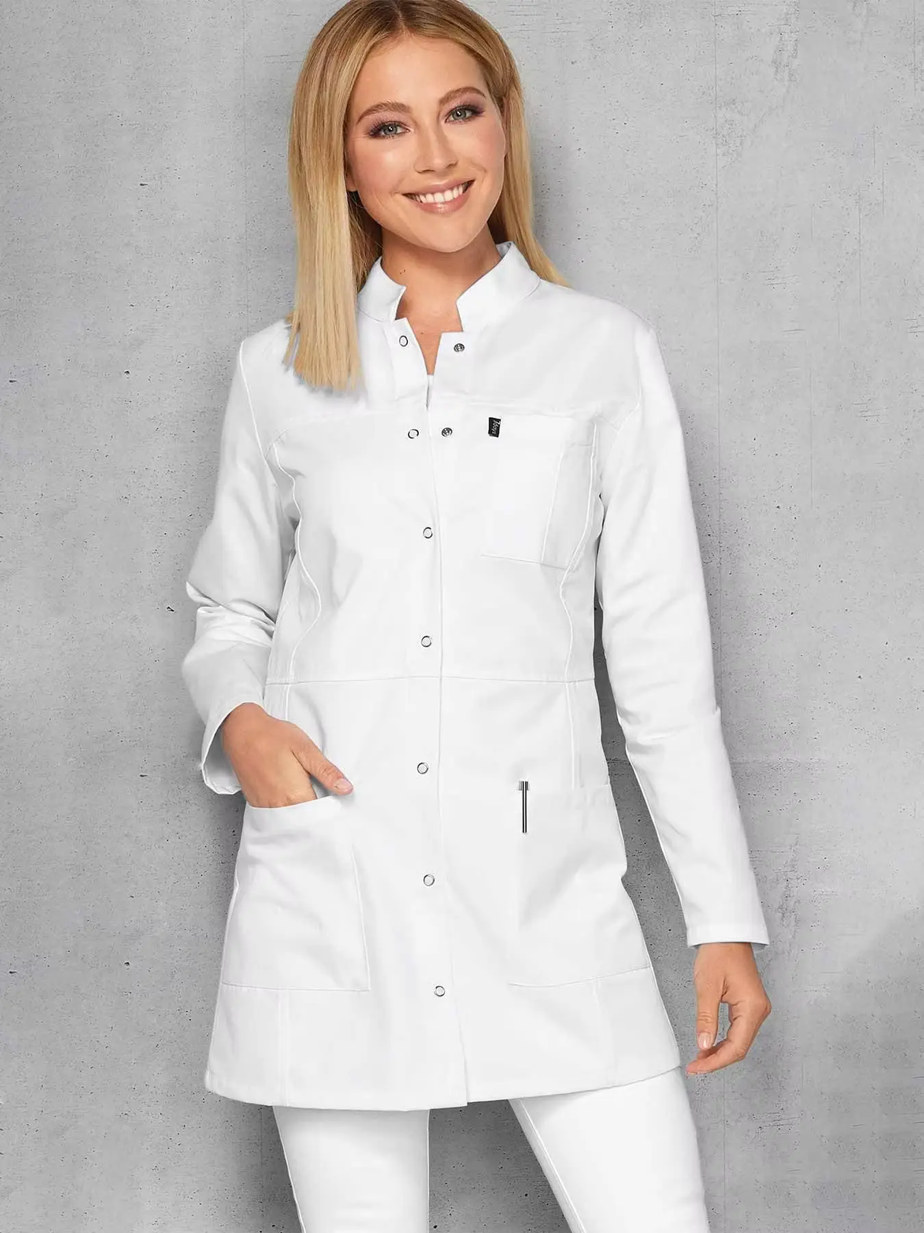 Plášť se stojáčkem, 2 boční našité kapsy, 1 náprsní kapsa s extra kapsičkou na tužku, dlouhé rukávy a dekorativní švy. Délka u velikosti 36 cca 79 cm. Materiál: tkanina 65 % polyester a 35 % bavlna, gramáž 245 g/m², vhodné pro praní na 95 °C.