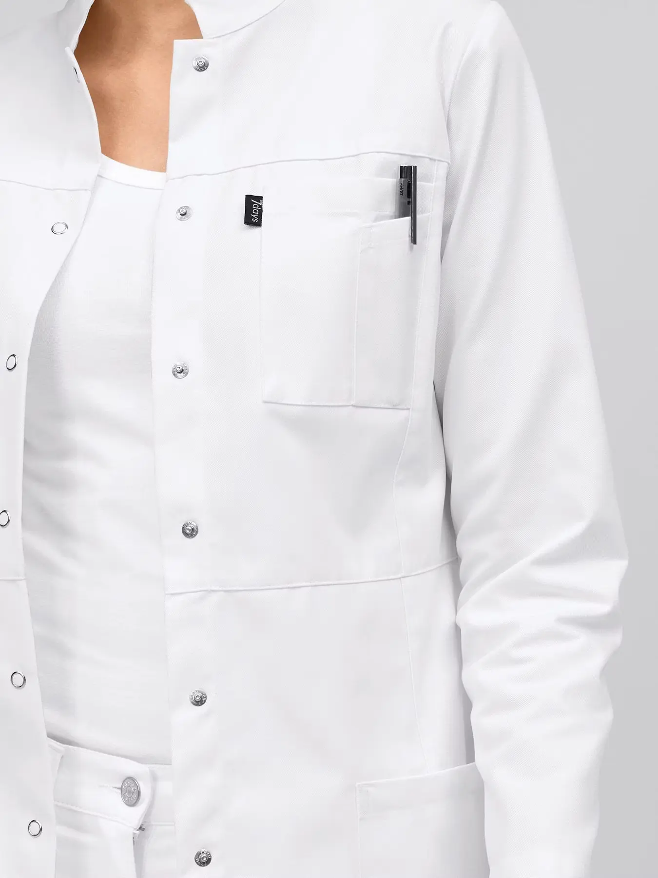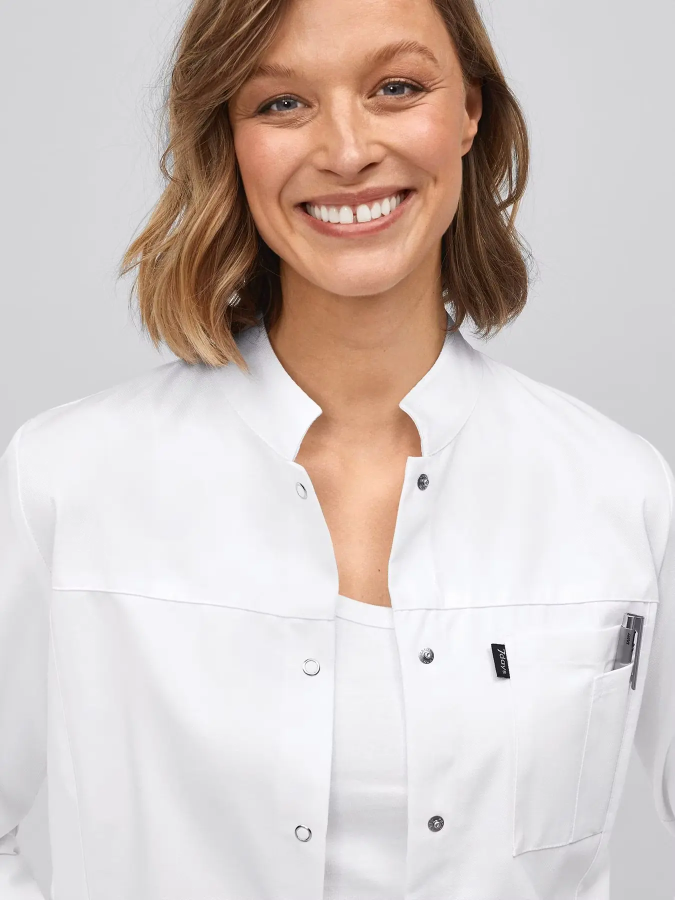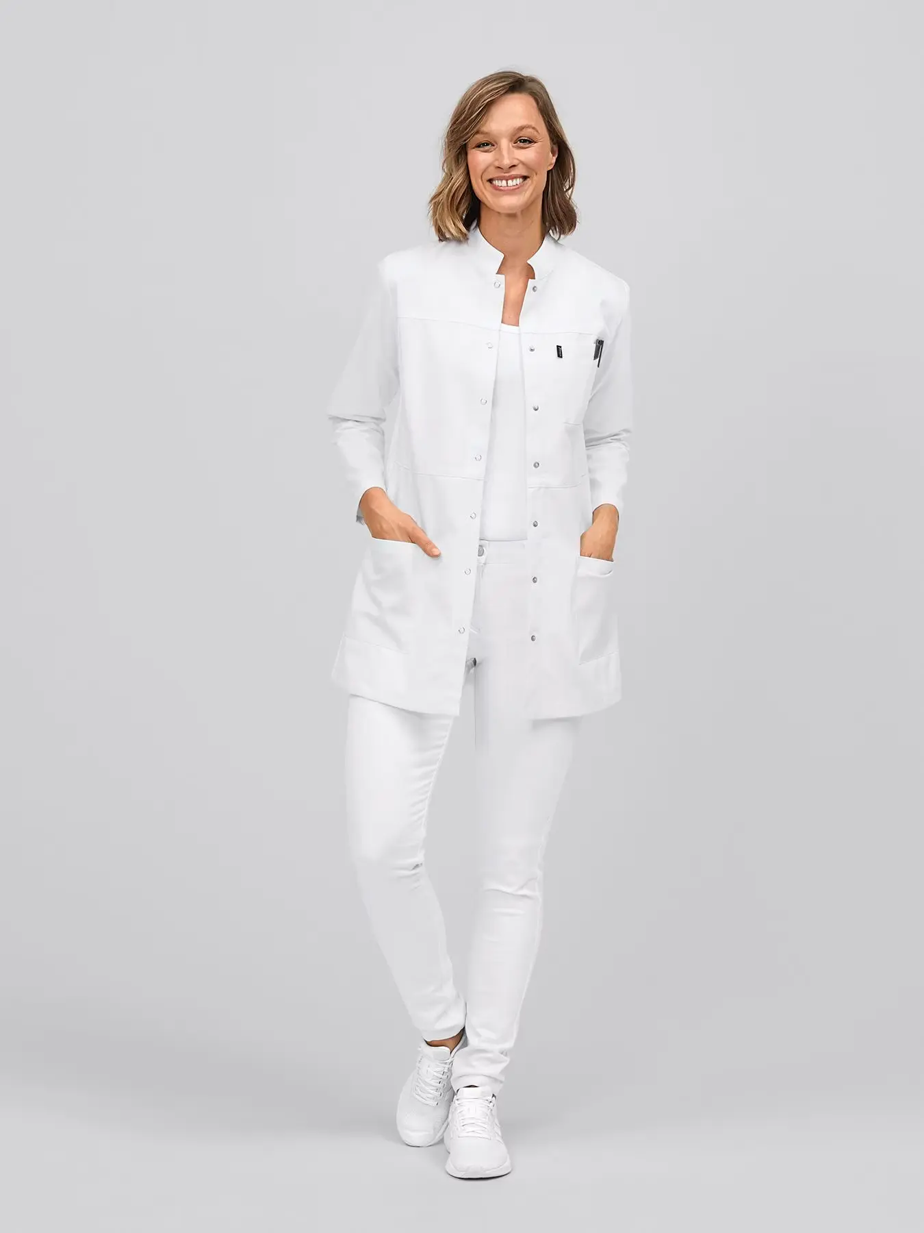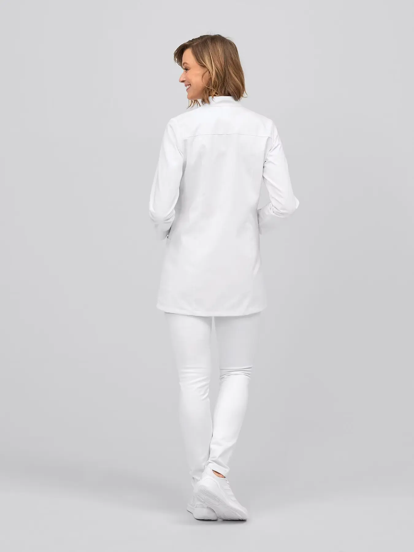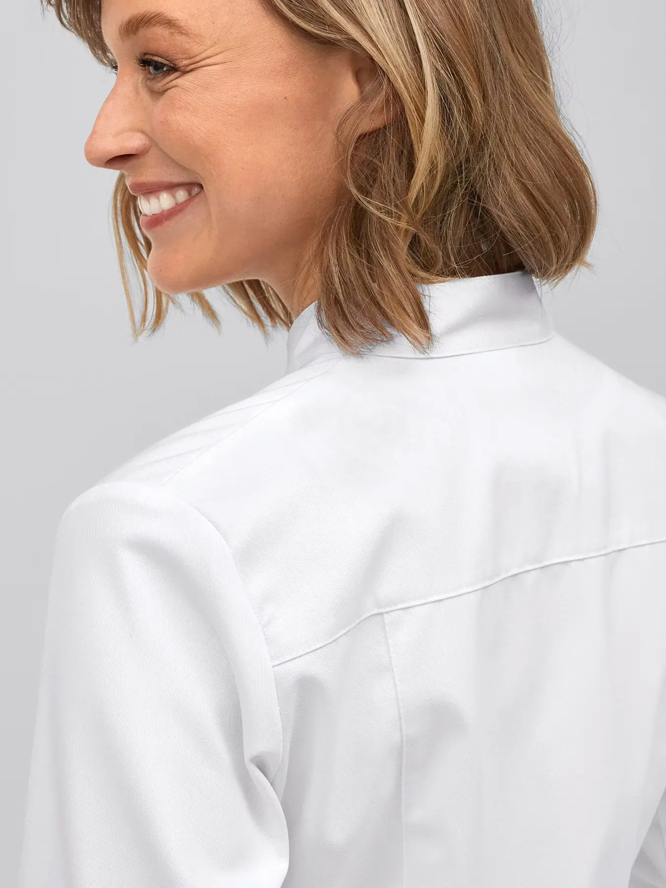 Plášť se stojáčkem, 2 boční našité kapsy, 1 náprsní kapsa s extra kapsičkou na tužku, dlouhé rukávy a dekorativní švy. Délka u velikosti 36 cca 79 cm. Materiál: tkanina 65 % polyester a 35 % bavlna, gramáž 245 g/m², vhodné pro praní na 95 °C.