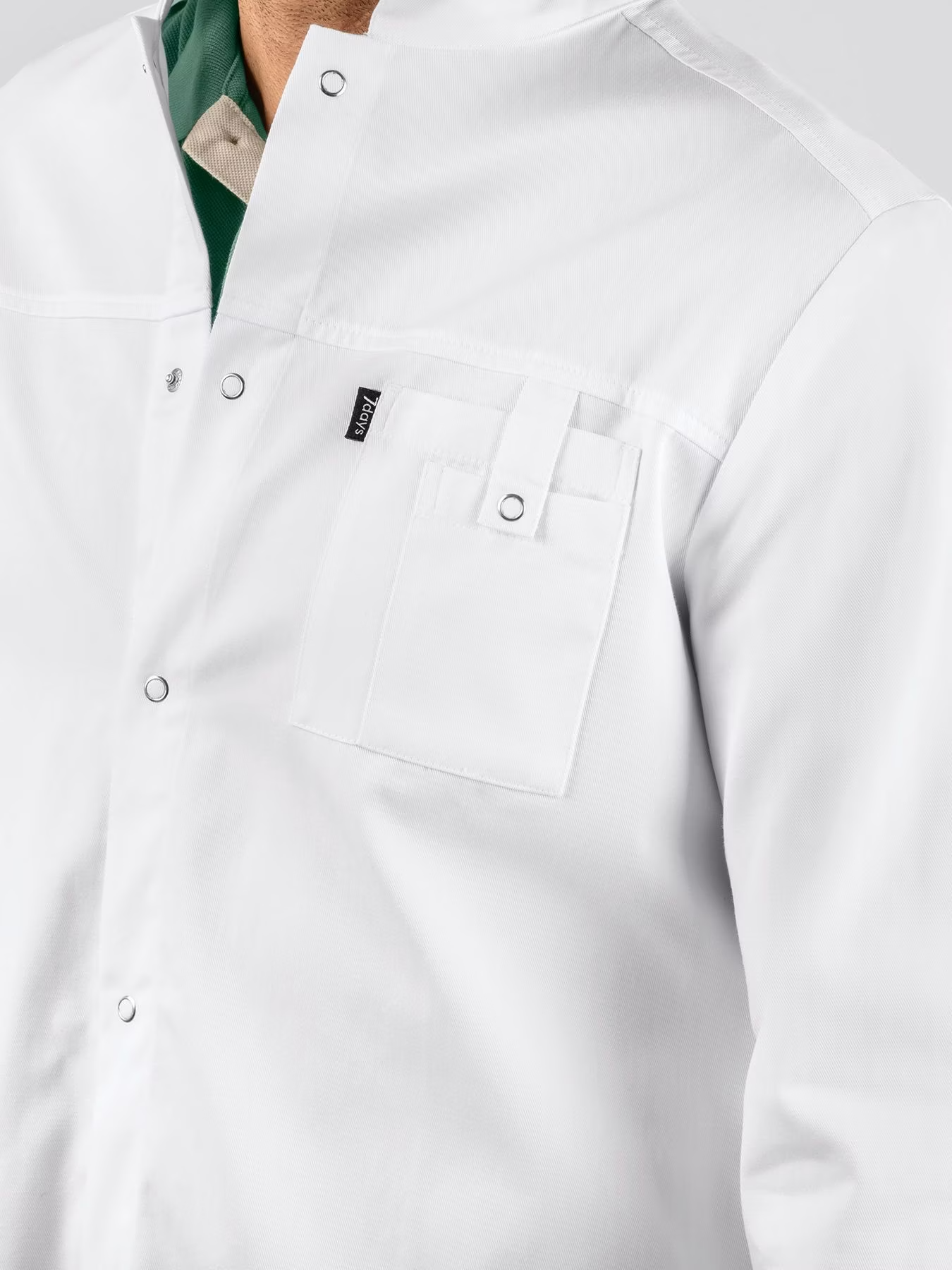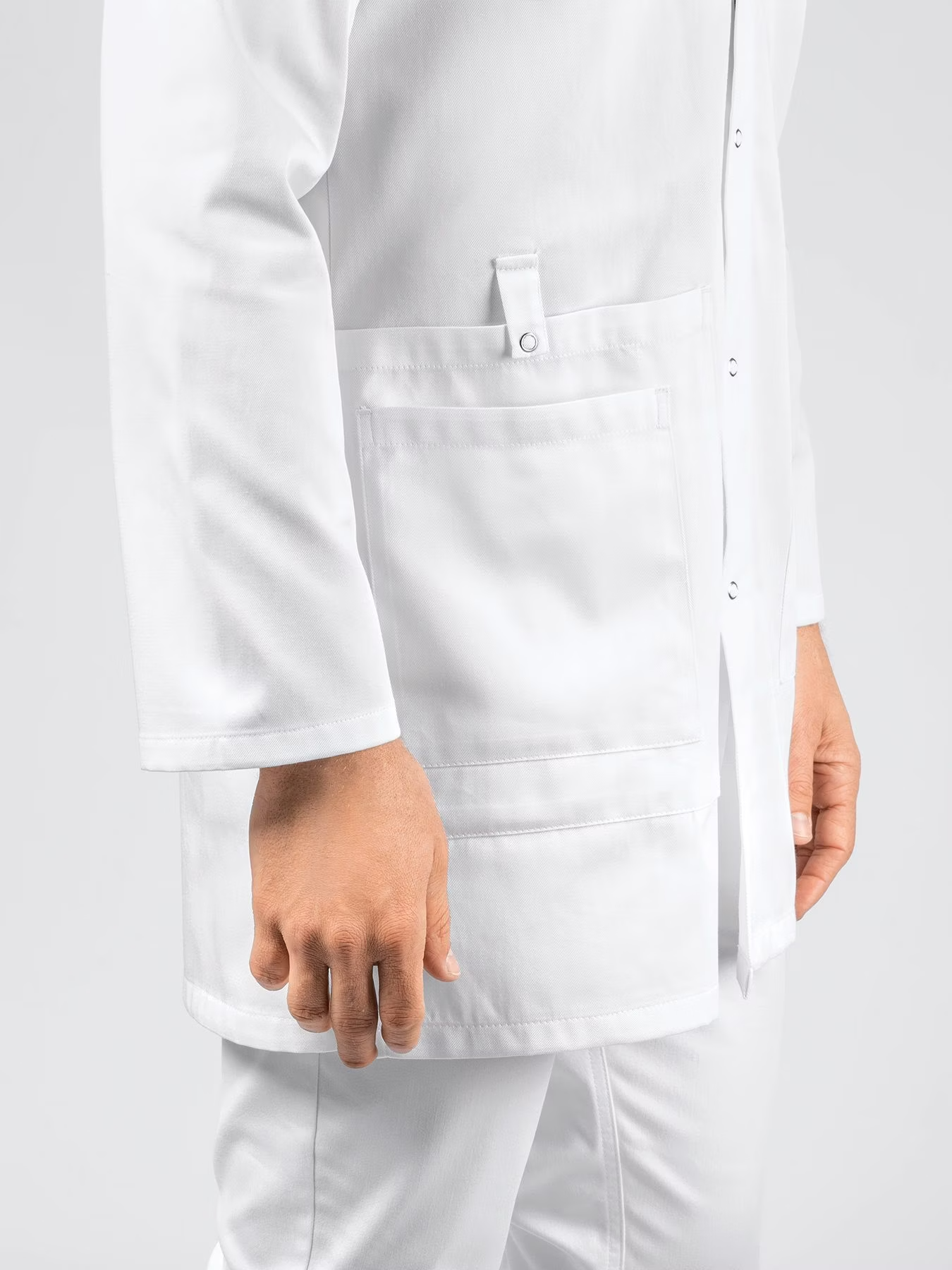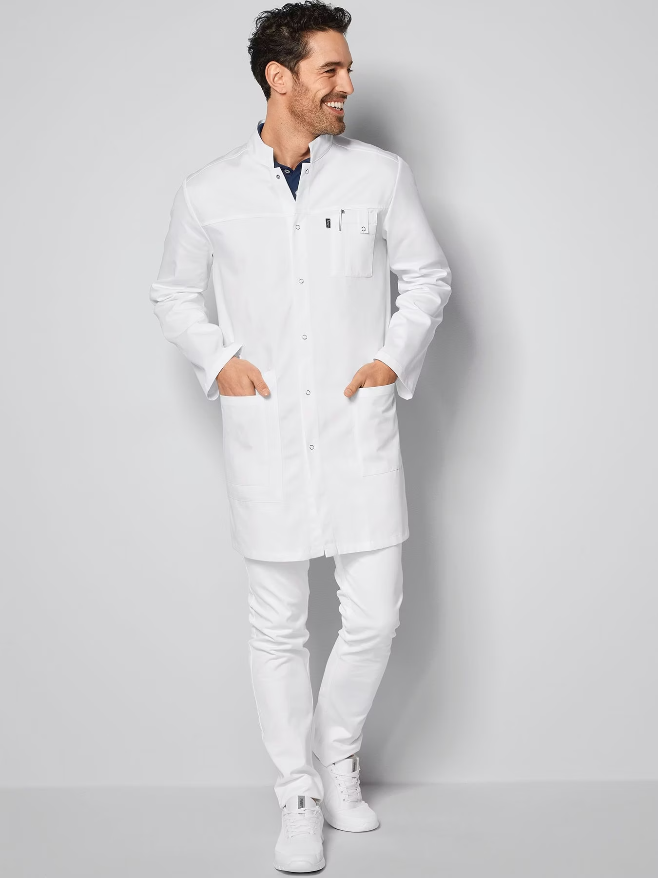 Lékařský laboratorní plášť se stojáčkem, celopropínacím zapínáním na patentky a dlouhými rukávy. Obsahuje náprsní kapsu s přídavnou menší kapsou a patentkem, 2 kapsy na bocích, přičemž pravá má velkou přídavnou kapsu s páskem na zavření. Délka zad cca 90 cm. Tkanina ze 100 % bavlny, gramáž 210 g/m², vhodné pro praní na 95 °C i do sušičky.