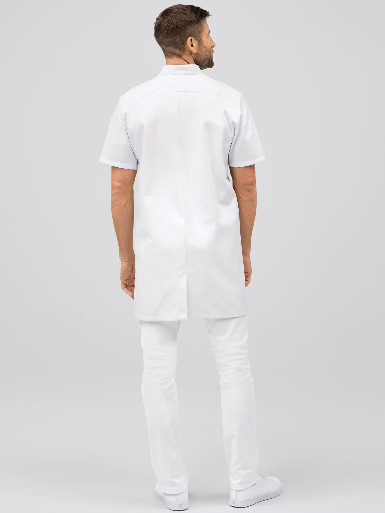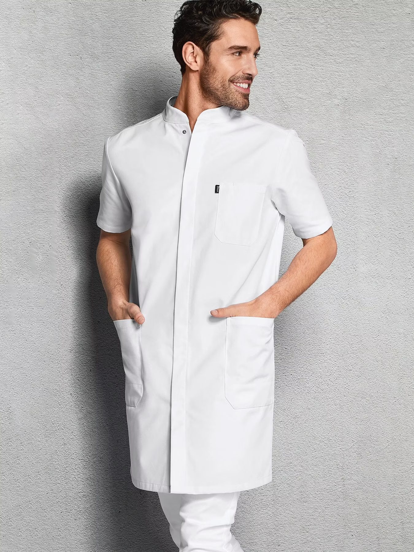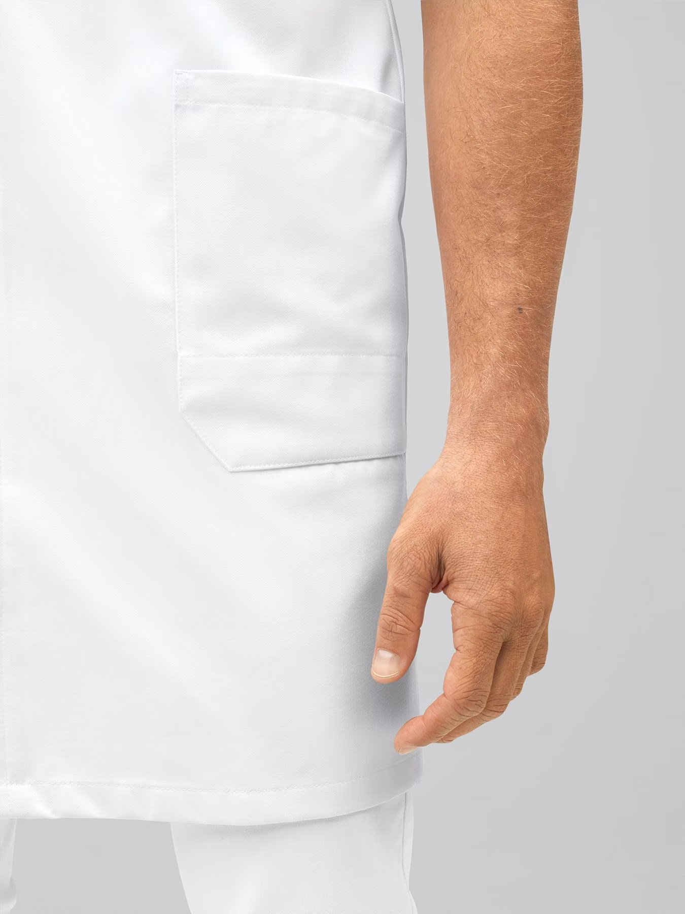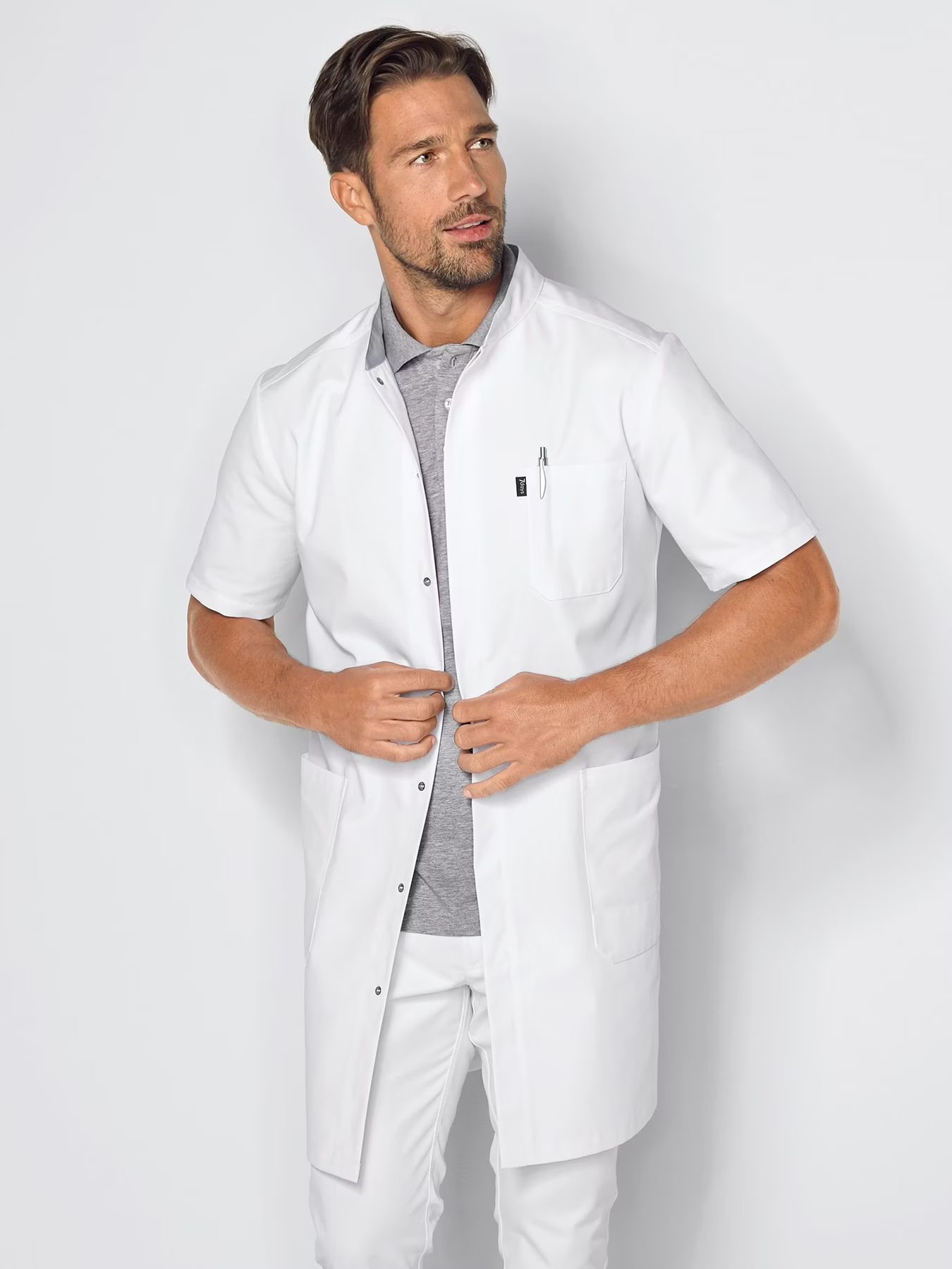 Krátký plášť s malým stojáčkem a skrytým zapínáním na patentky. Vnitřní límec v kontrastní barvě, 1 náprsní kapsa s oddělenou kapsou na propisku, 2 velké kapsy po stranách a rozparek na zadní straně. Délka zad u velikosti M je cca 96 cm. Materiál: 65 % polyester, 35 % bavlna, gramáž 245 g/m², pevná tkanina. Vhodné pro praní na 95 °C i sušení v sušičce.