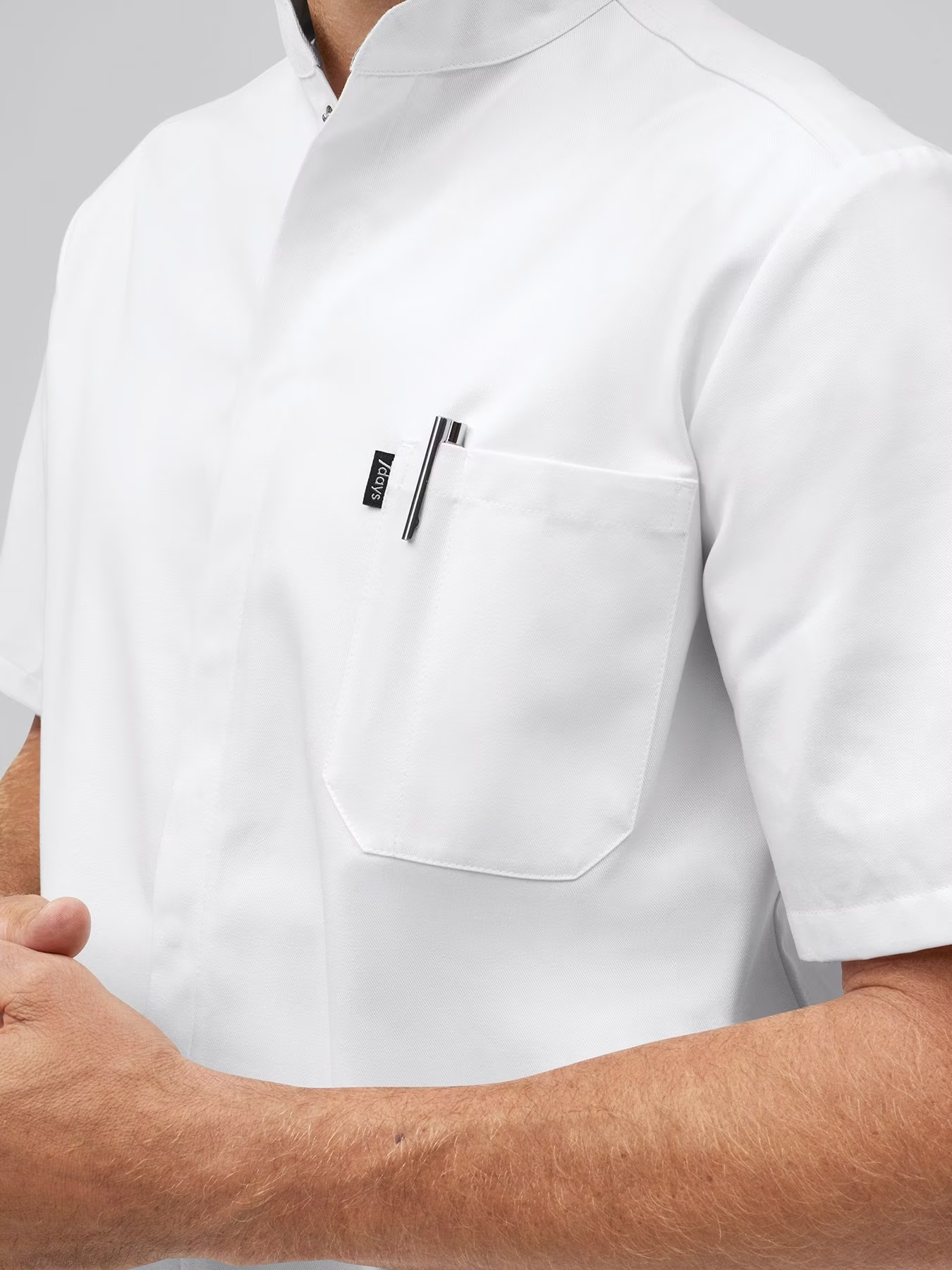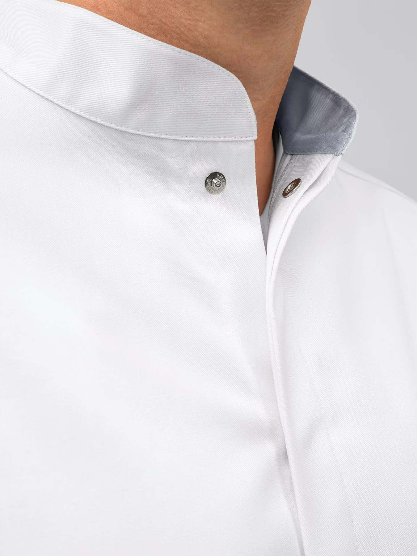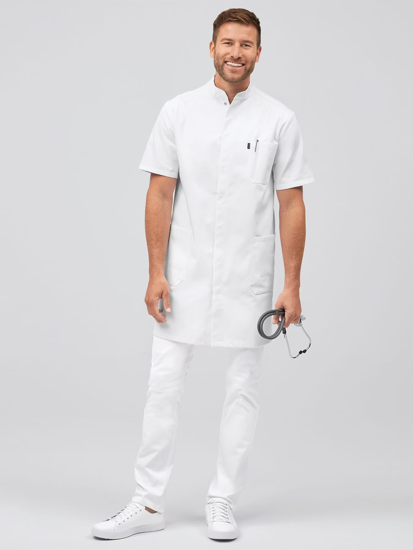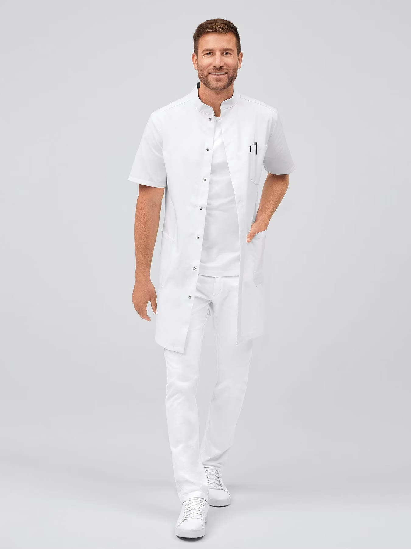 Krátký plášť s malým stojáčkem a skrytým zapínáním na patentky. Vnitřní límec v kontrastní barvě, 1 náprsní kapsa s oddělenou kapsou na propisku, 2 velké kapsy po stranách a rozparek na zadní straně. Délka zad u velikosti M je cca 96 cm. Materiál: 65 % polyester, 35 % bavlna, gramáž 245 g/m², pevná tkanina. Vhodné pro praní na 95 °C i sušení v sušičce.