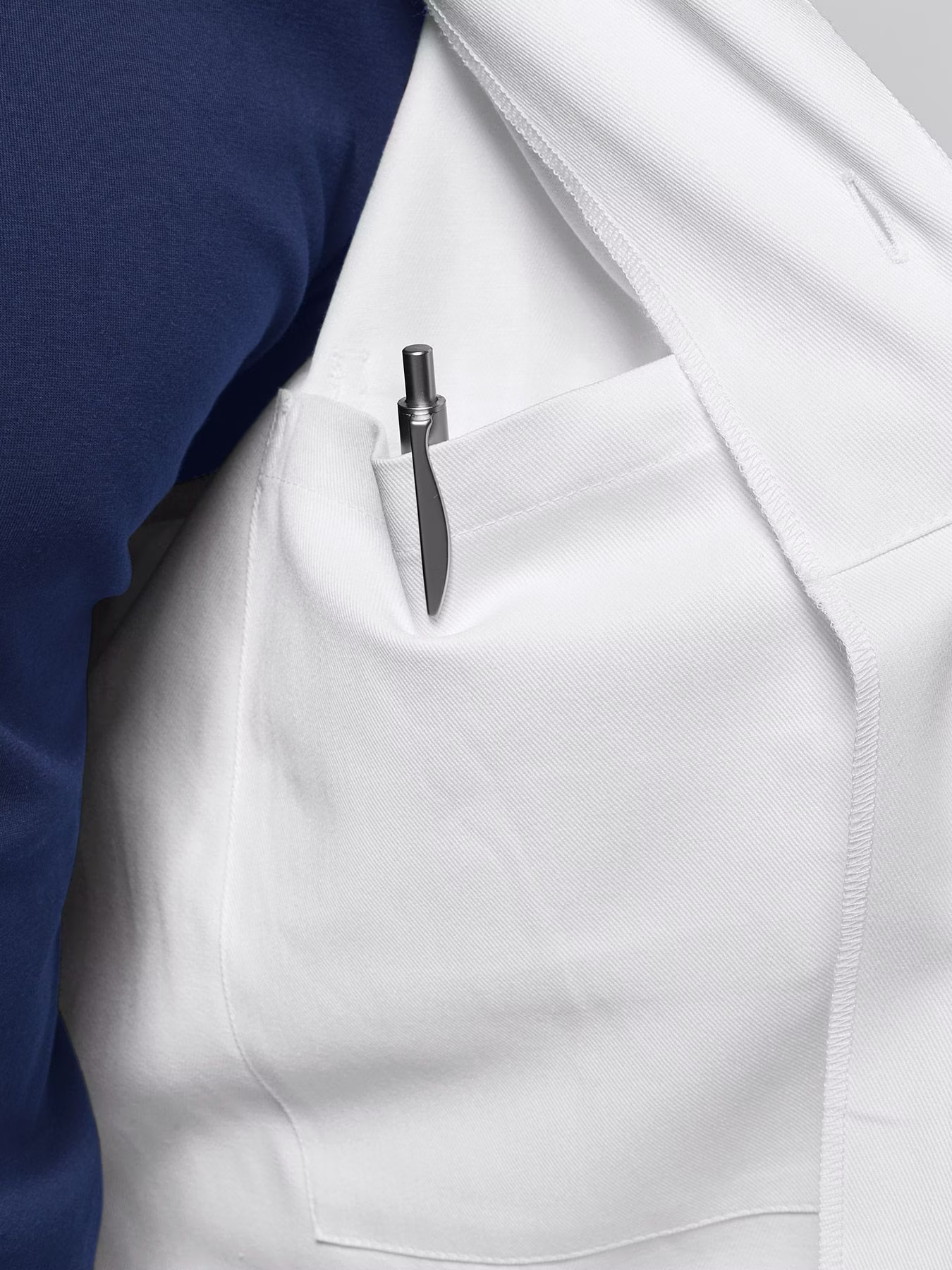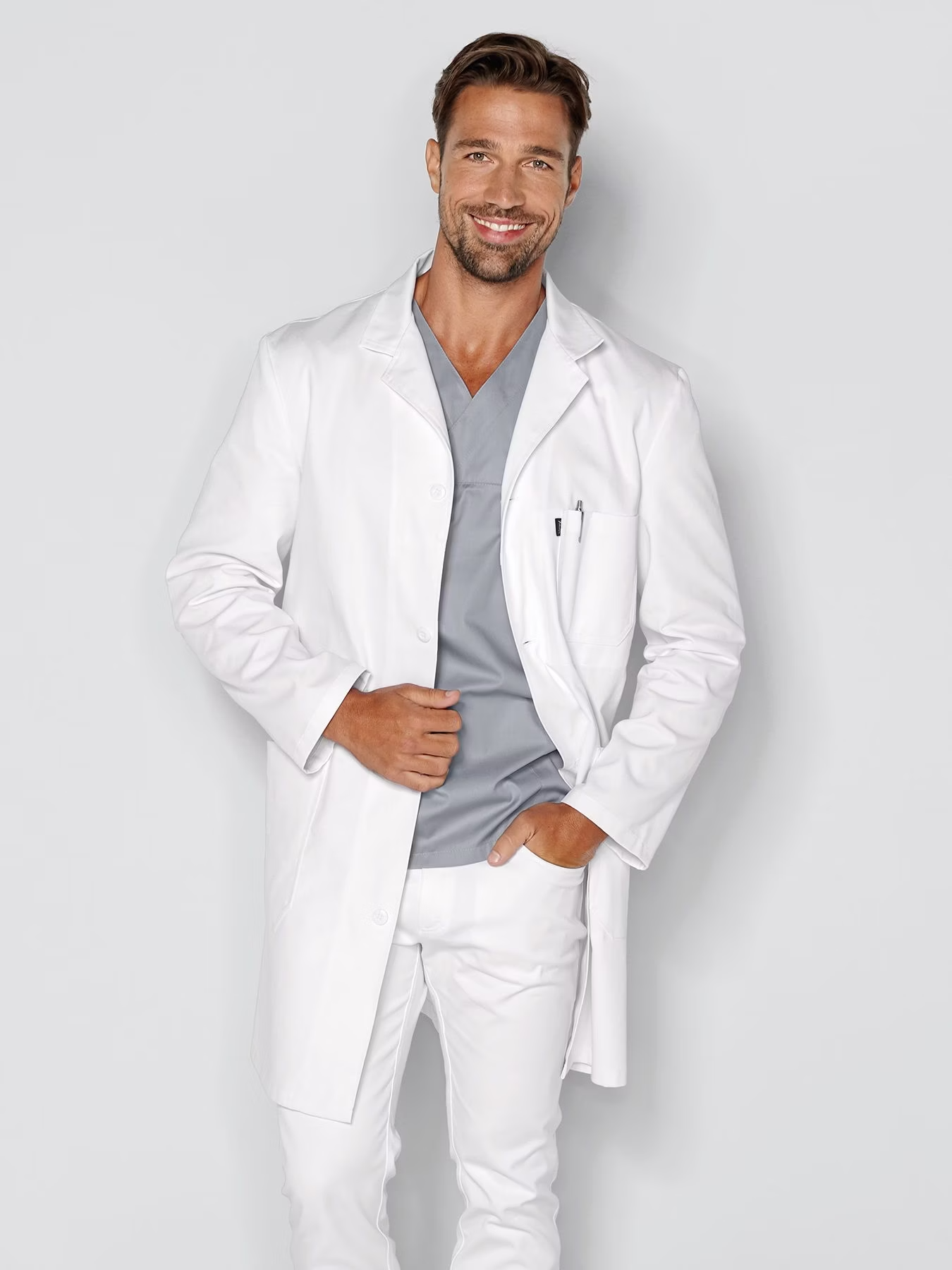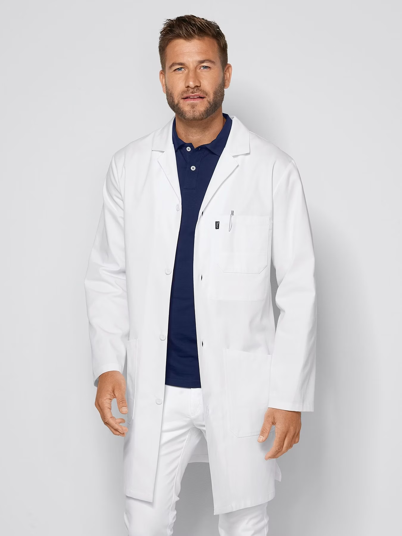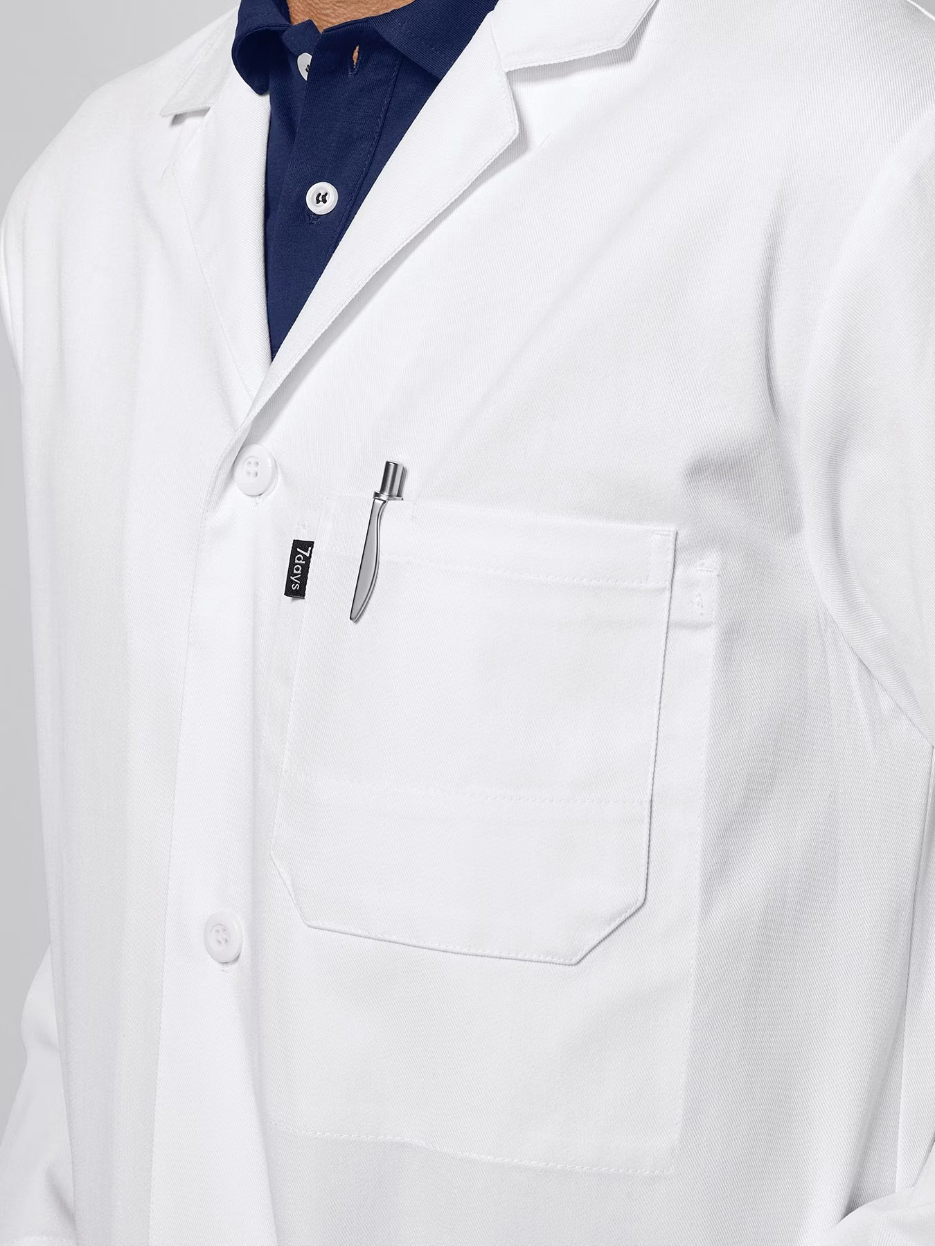 Lékařský laboratorní plášť s 1 vnitřní kapsou, 1 náprsní kapsou a 2 našitými kapsami na bocích. Fazónkový límec, délka zad u velikosti 50 je cca 96 cm. Tkanina ze 100 % bavlny, plášť je vhodný pro praní na 95 °C i pro sušení v sušičce. Gramáž 240 g/m².